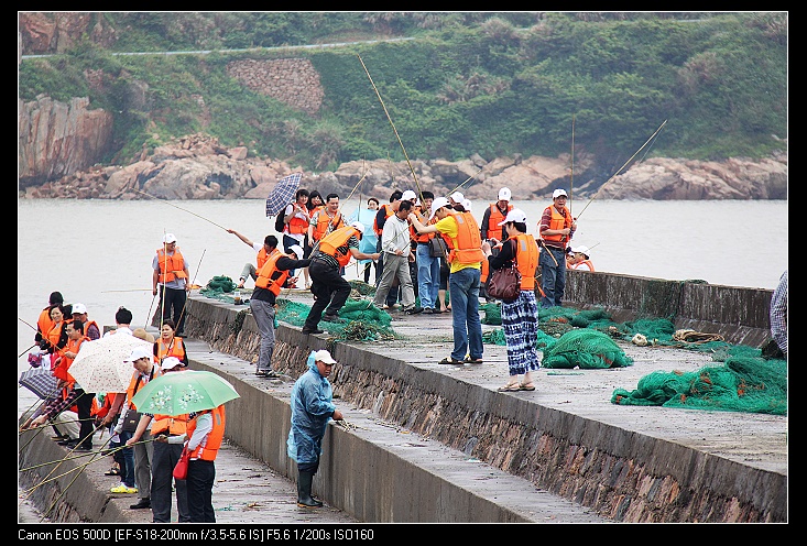 5月19日,在淅淅瀝瀝的小雨中,大家登上了去嵊泗的快艇,開始了新一天的旅程。經(jīng)過了一小時(shí)的船程,我們到達(dá)了嵊泗列島本島,雨天加上略帶寒意的海風(fēng)并沒有降低大家的熱情,上午,乘小木船去釣魚點(diǎn)釣魚,下午,乘車去了碧海金沙海灘。